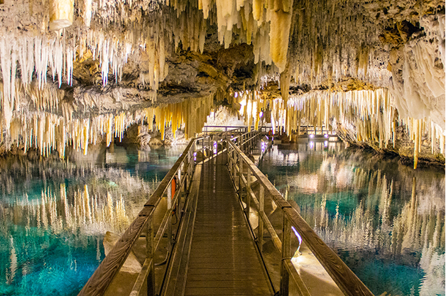 200 feet underground is Crystal Cave, a cavernous treasure where jagged stalactites hang down from the limestone “ceiling” above. Venture across a pontoon bridge over a perfectly clear, 55-foot-deep subterranean lake or to the even deeper Fantasy Cave.